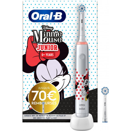 La brosse à dents électrique Oral-B Junior Minnie, adaptée aux enfants de 6&ans et plus, est conçue avec des dentistes pour un nettoyage supérieur. Pour protéger les gencives fragiles des enfants, elle est dotée d’un contrôle de la pression des gencives à 360º&qui clignote en rouge et réduit la vitesse de brossage lorsqu’il détecte un brossage trop vigoureux. De plus, elle est livrée avec 2&brossettes extra douces Sensi Ultrathin. Pour rendre le brossage encore plus amusant, elle peut être utilisée avec l’application Disney Magic Timer gratuite d’Oral-B. 90&% des enfants se brossent les dents plus longtemps avec cette application. C’est la brosse idéale pour aider les enfants à se brosser les dents de façon autonome et à développer des habitudes de brossage saines qui les accompagneront tout au long de leur vie.