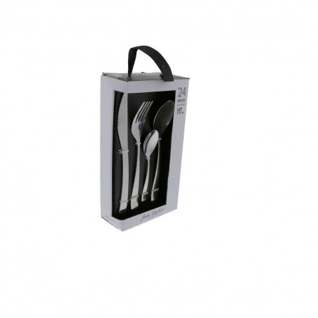 Ménagère 24 pièces RANCH - 6 couteaux, 6 fourchettes, 6 cuillères de table et 6 cuillères à café.Couverts en acier inoxydable.Compatible lave-vaisselle.24 pièces en boîte cadeau.Matière : Acier inox.Sécher avec un chiffon doux après chaque lavage