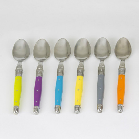Découvrez le coffret de 6 cuillères à café en acier inoxydable avec des manches colorés ABS qui se déclinent dans des tons tendance, de la gamme Laguiole de Jean Dubost! Modernes et flashy ces petites cuillères conviennent à une utilisation quotidienne.