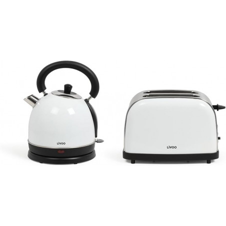 Set petit déjeuner vintage en acier inoxydable incluant / Une bouilloire électrique sans fil capacité 1,8L / Arrêt automatique & Base pivotante à 360° / Filtre anticalcaire amovible et lavable / Indicateur de niveau d’eau & Poignée cool touch / Protection anti-chauffe à sec / Un grille-pain 2 larges fentes / 3 fonctions avec témoins LED: décongélation, réchauffage, annulation / Thermostat réglable 6 niveaux & Éjection automatique / Tiroir ramasse-miettes, Pieds antidérapants & Enrouleur de câble intégré